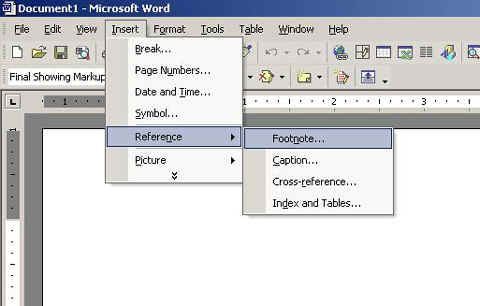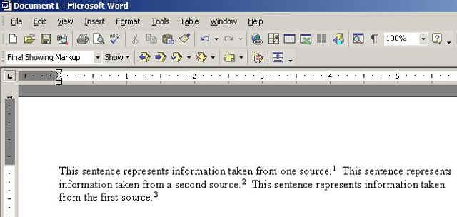 Within the text of the paper, the only reference to a citation is a small, superscript number following the information that is being cited. Most word processing programs with a reference function automatically insert the correct number. The citation numbers must be consecutive all the way through the paper. If the paper has twenty footnotes, the the first citation number is 1 and the last citation number is 20. The numbering does not begin with 1 at the beginning of each page.